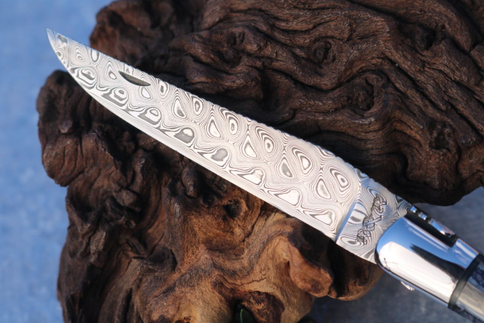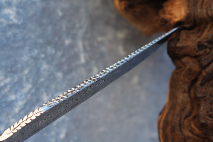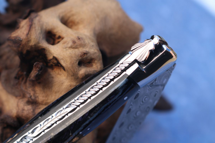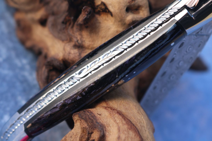 - Klinge: Edelstahldamast (Fishbone) Fa. Damasteel oberhalb verziert