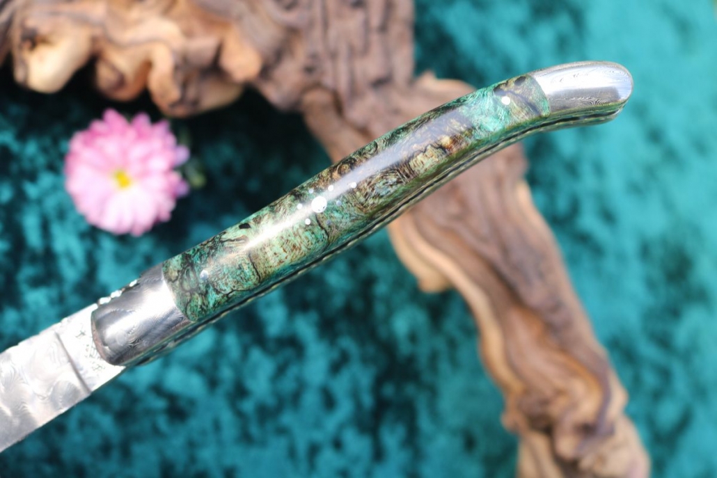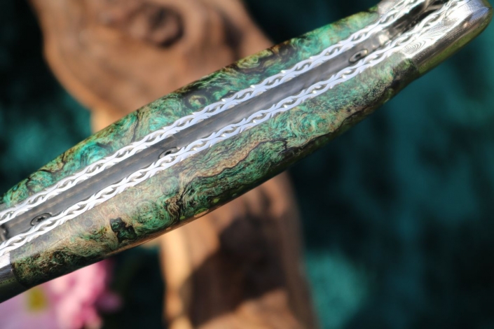 - Griffmaterial: stabilisierte grüne Ahornwurzel sowie 2 Edelstahlplatinen umlaufend verziert