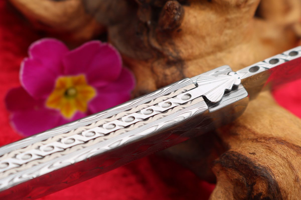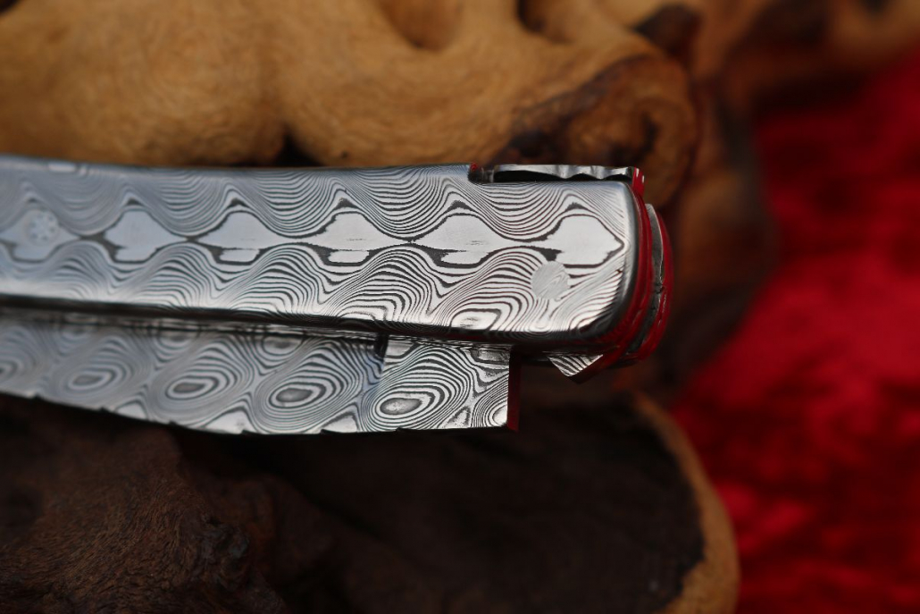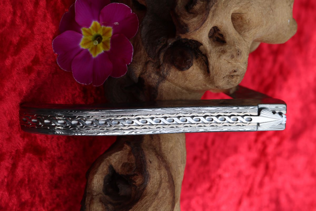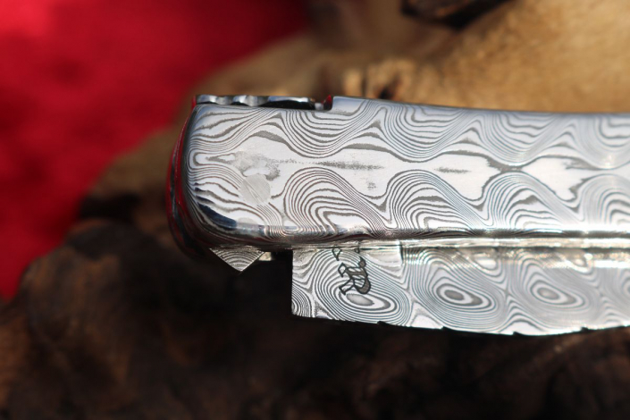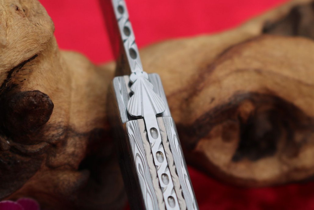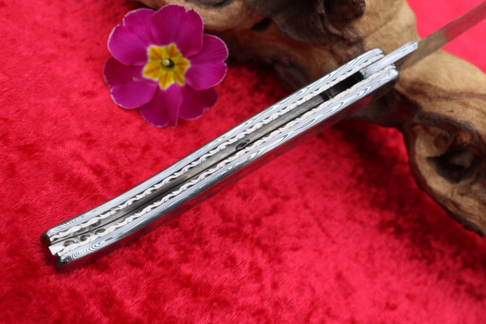 • Griffmaterial: aus gehärtetem Edelstahldamast (Fish) Fa. Damasteel sowie 2 Titanplatinen umlaufend verziert, Klingenachse und hinterer Stift aus Damast
