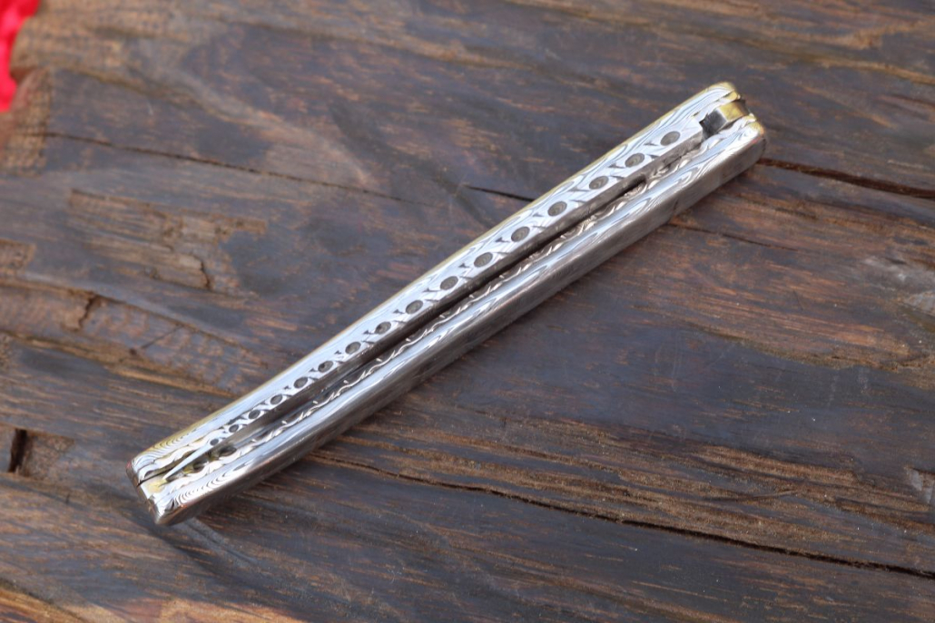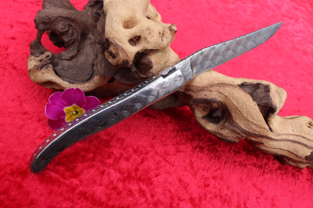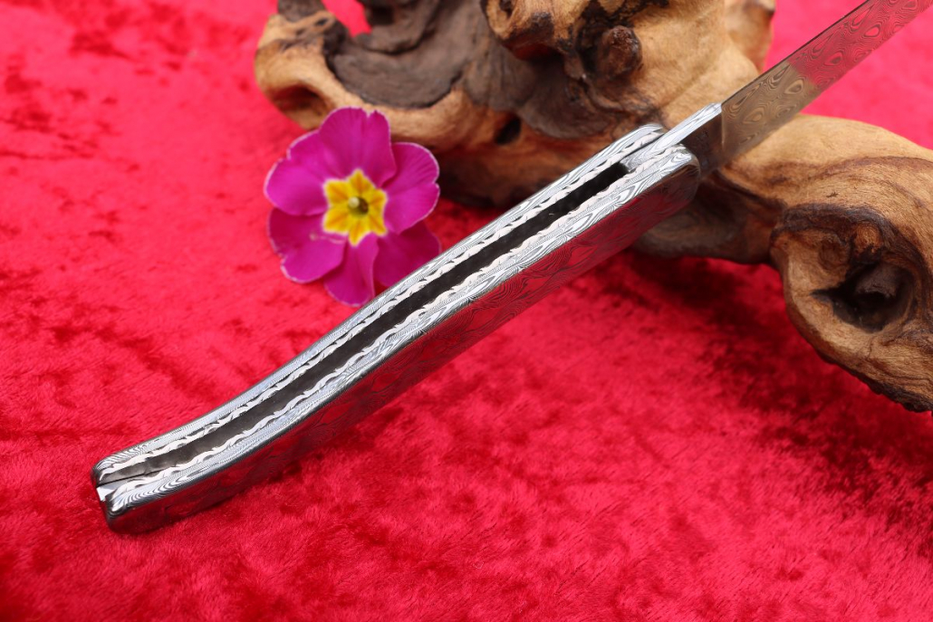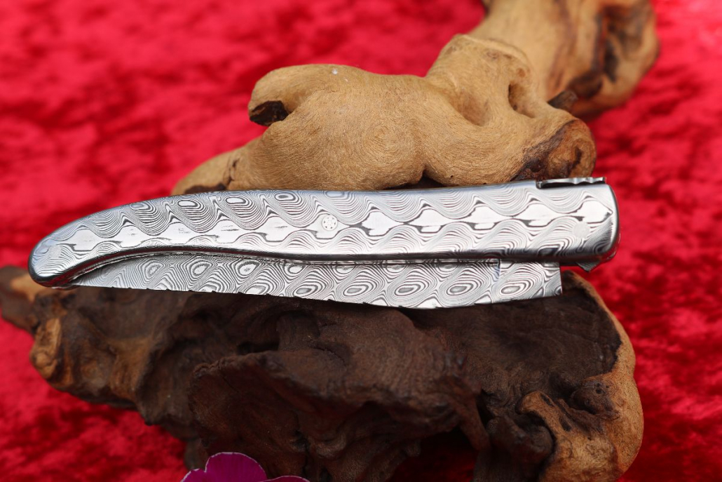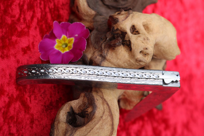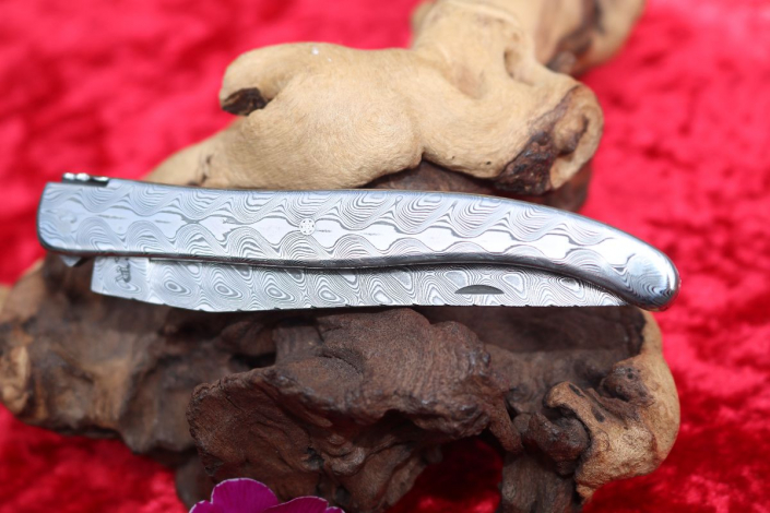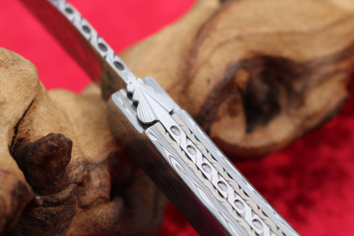 • Griffmaterial: aus gehärtetem Edelstahldamast (Fish) Fa. Damasteel sowie 2 Titanplatinen umlaufend verziert, Klingenachse und hinterer Stift aus Damast