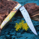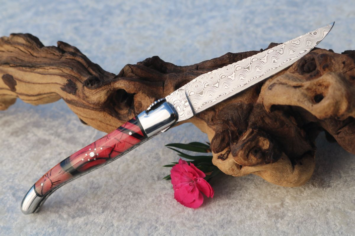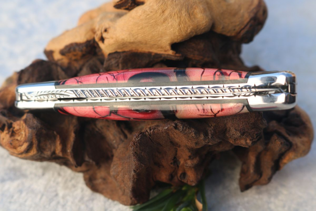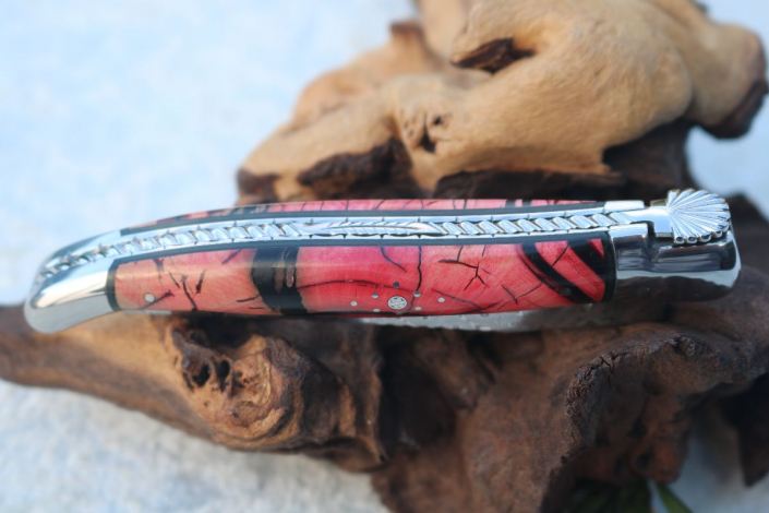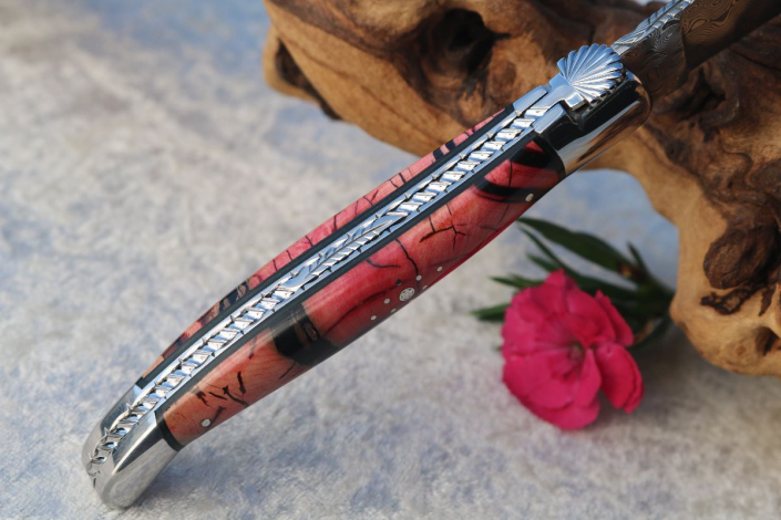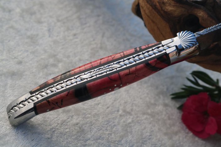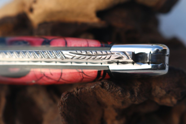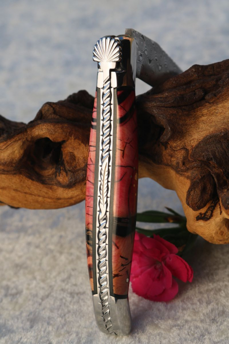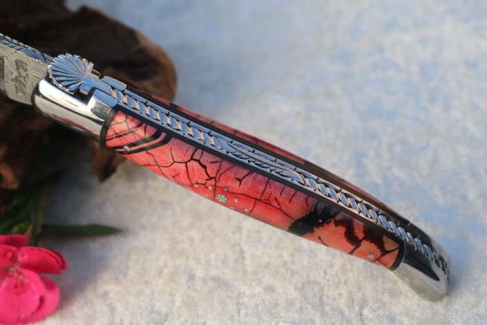 • Griffmaterial: rot- schwarz Mammutelfenbein aus der Scheibe geschnitten (ca. 20.- 50.000 Jahre alt )  sowie  1 Edelstahlplatinen umlaufend verziert